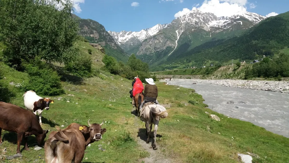 In the morning, we meet the horses and get acquainted with them. We set off on our journey, enjoying breathtaking panoramic views throughout the day. The trail passes by numerous Svanetian structures—Svaneti is rightly called the Land of a Thousand Towers. By evening, we arrive in the village of Chvabiani and stay overnight in a guesthouse.
